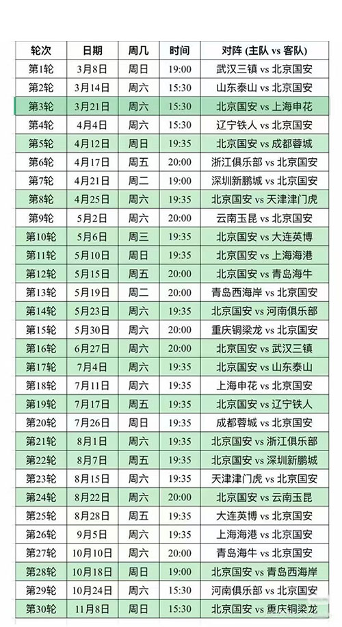 2026赛季中超北京国安主场赛程:
